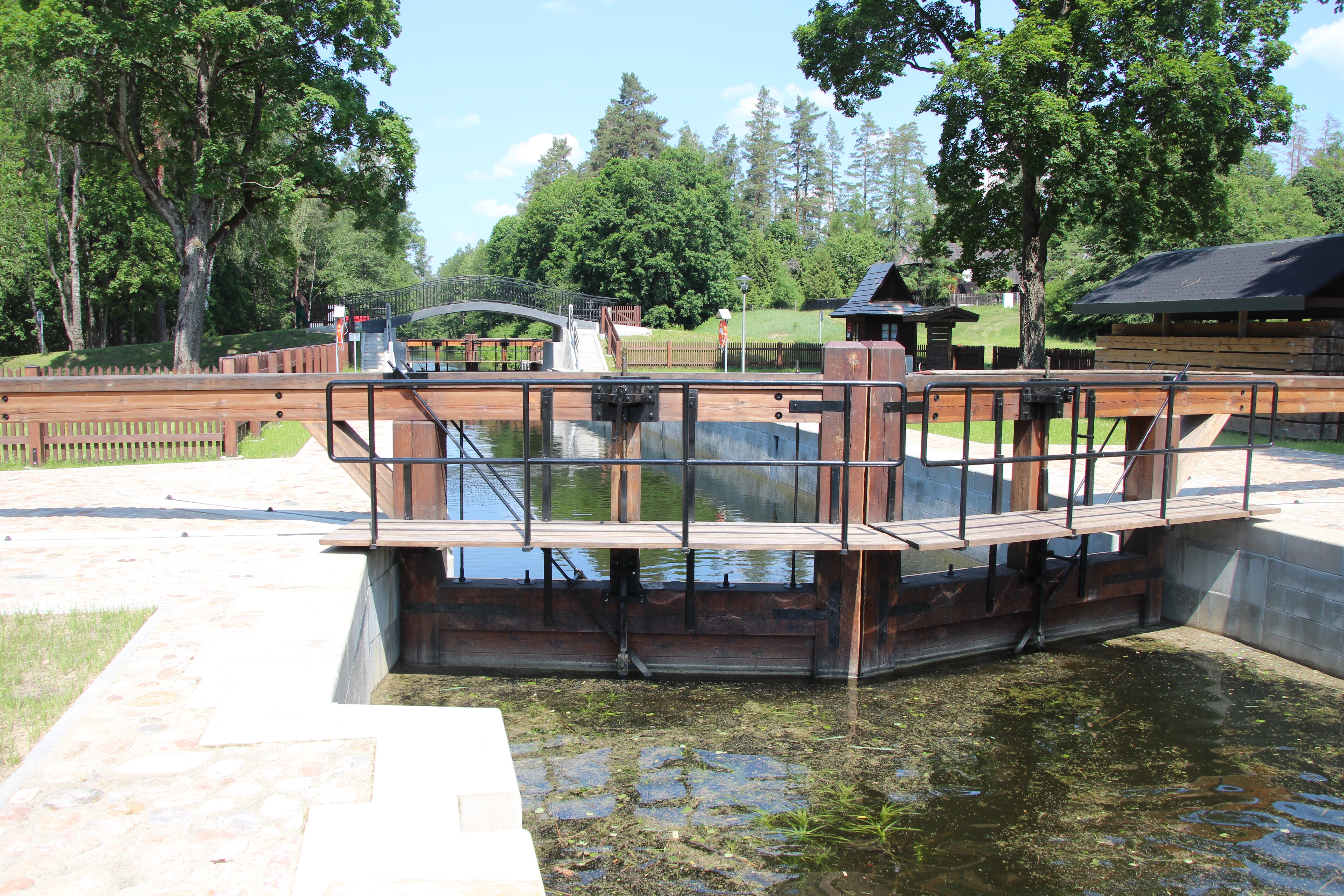 Die 18 Schleusen wurden im 2. Weltkrieg komplett zerstört. Allesamt wurde seitdem neu aufgebaut und die jeweiligen Schleusenwärter erhielten landestypische Holzhäuser.